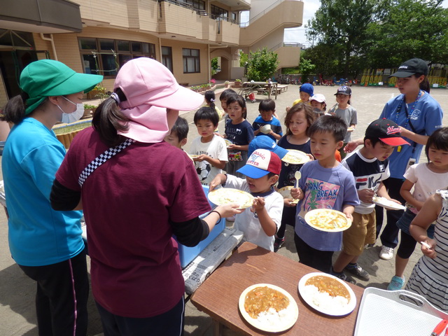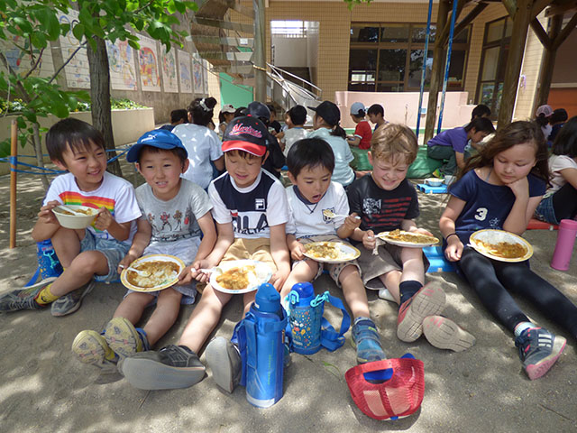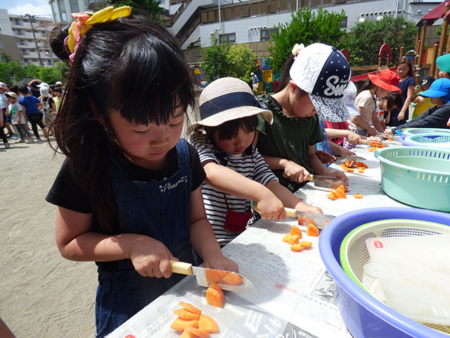 園生幼稚園を卒園したお友達が、幼稚園でみんなと遊んだりご飯を作ったりして楽しく過ごします