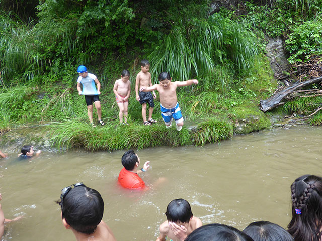 川にめがけてジャンプ