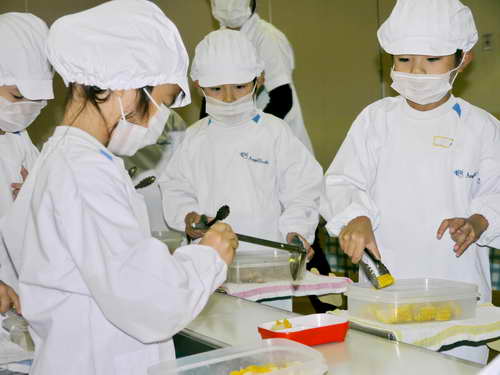 ベルトコンベアーに乗ってやってくるおべんとうばこを目の前にこどもたちが食材をテンポ良くつめていき今日のお給食をつくりました