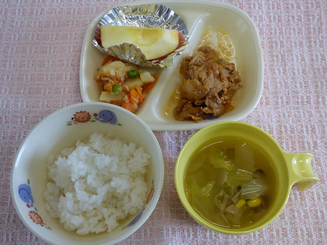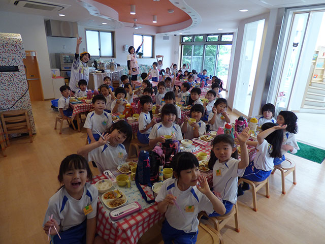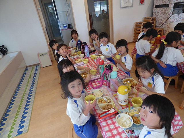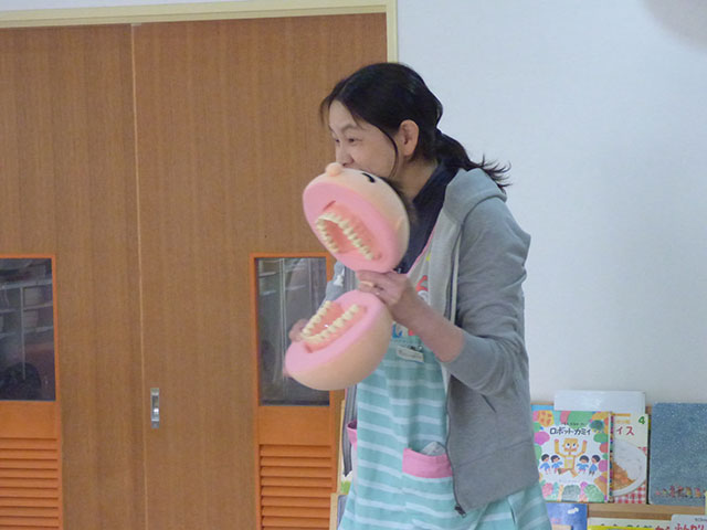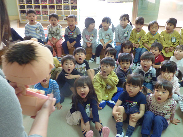 今日は、年少組で歯磨き指導を行いましたじゅうたんの部屋に集まって幼稚園の看護師さんのお話を聞きます虫歯になってしまったお友達の紙芝居を読んで貰ったり・・・お人形と一緒に歯磨きの仕方の練習ですお人形と一緒に大きく口をあ~んこれからも歯ブラシをしっかり動かして歯磨きを頑張ろうねお昼には・・・ばら組とゆり組で ランチルームランチを楽しみました久しぶりのランチルームでのご飯楽しいね~今後も、英語教室の時間によって、ランチルームランチの順番も回ってきますお楽しみに~ ☆☆今日の給食☆☆・ご飯・コンソメスープ・豚肉のケチャップ炒め・じゃが芋のツナ煮・りんご
