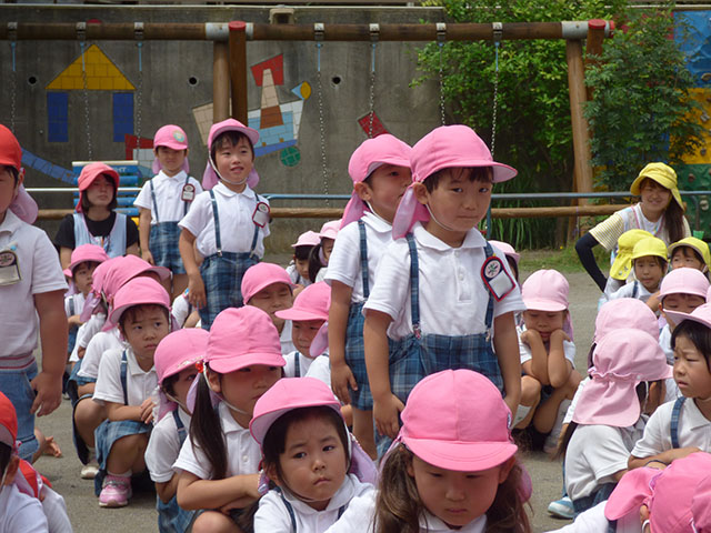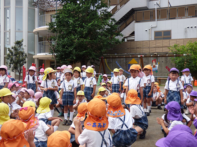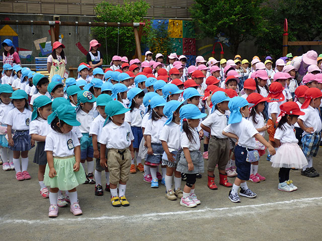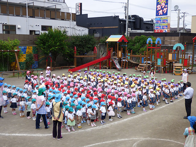 園庭で終業式を行うことが