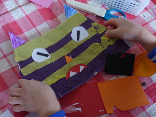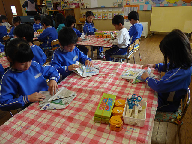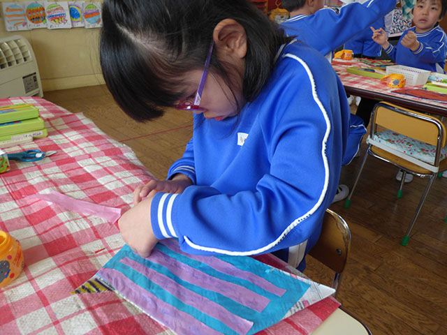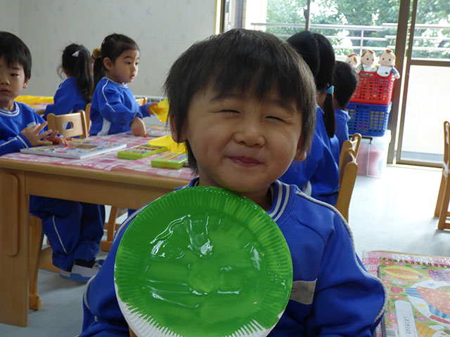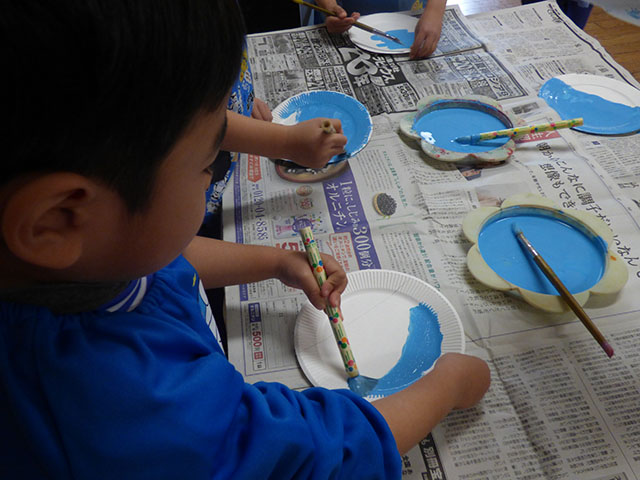 節分に向けておに作りが始まりました年長組では大きな紙を折っておにを作ります折り終わったおにに模様や顔を作って・・・格好良いおにの出来上がり~年少組は紙皿に絵の具を塗ります筆を上手に使って丁寧に塗ります綺麗に塗れましたどんなおにに仕上がるのかお楽しみに~