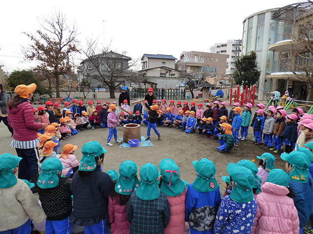 園庭に集まっておもちつきのスタート