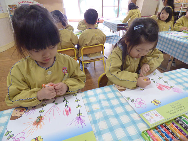 じっくり取り組む活動では、心を落ち着かせて集中して取り組めるように、そして、集中が持続できるようにと、年齢合わせて取り組んでいます。