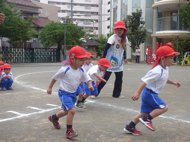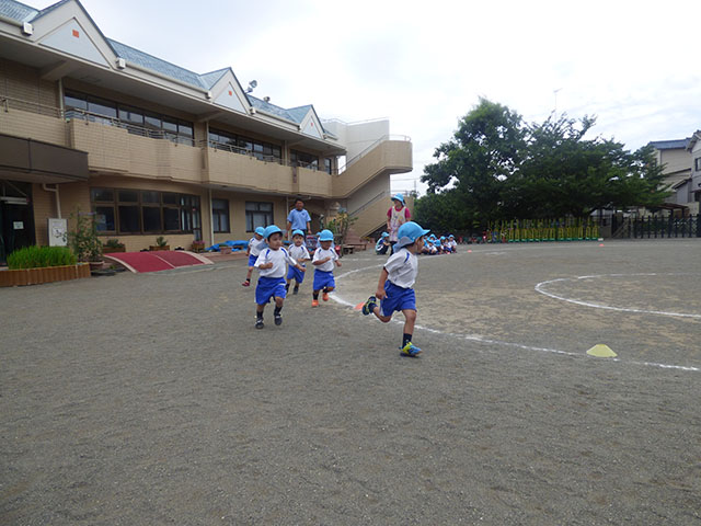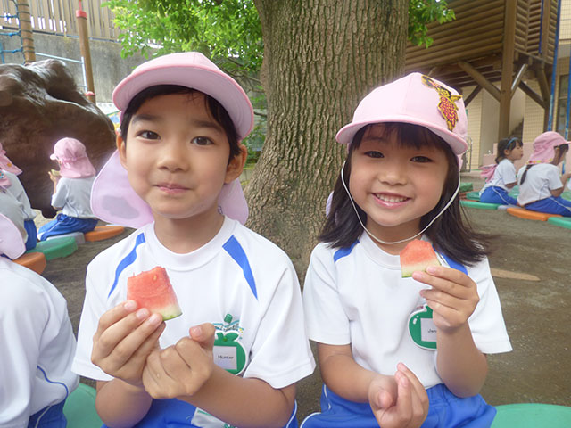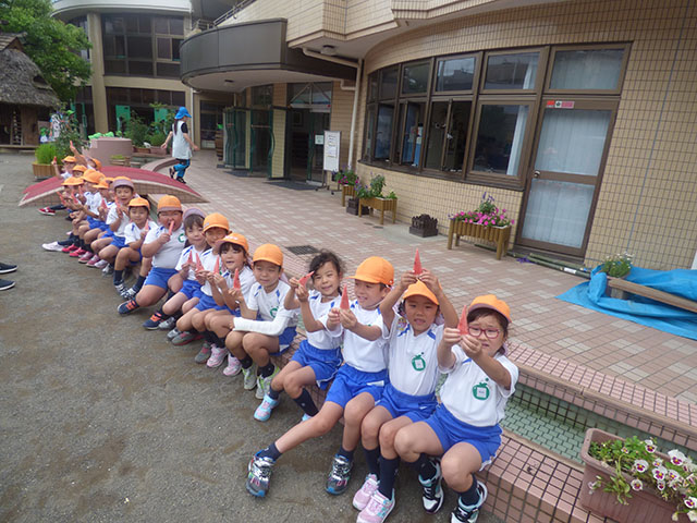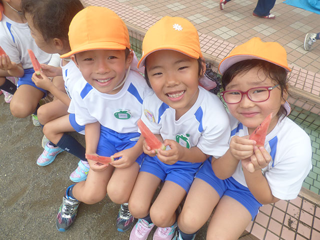 暑い毎日、いつも頑張っているみんなにと大きなすいかをいただいたので・・・ 今日は年長組さんがすいかをいただきました 美味しそう~いただきま~す甘くて美味しい~すいかpowerで元気いっぱい美味しかったね年少・年中さんも楽しみにしていてくださいね年少組は体操教室を行いました今日はかけっこの練習ヨーイ・ドンがんばれ・がんばれーー白い線に沿って走ります脱線せずに上手ー暑さに負けず元気いっぱいでした
