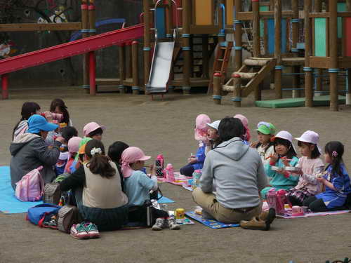 園長先生や担任の先生たちとお庭でLunch!