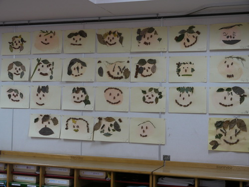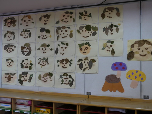 こちらの壁面は子ども達一人ひとりが葉っぱやドングリを使って思い思い「自分の顔はこんな感じかな