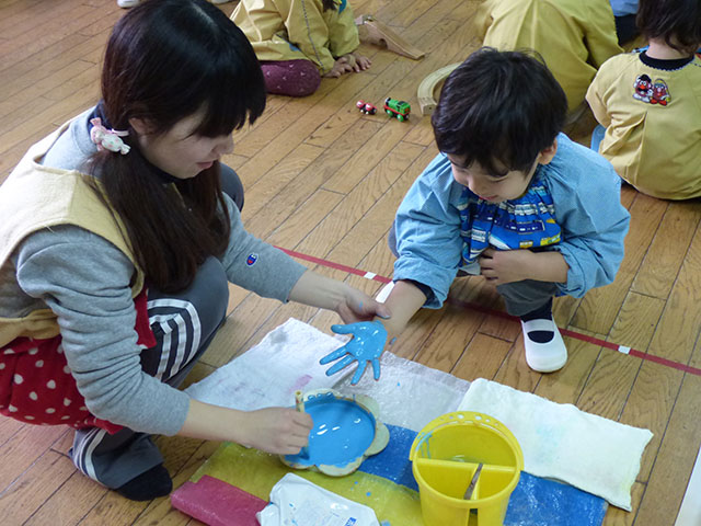 手に絵の具をつけて・・・