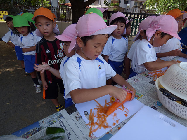 年長組はにんじんの皮むきと