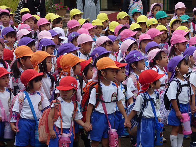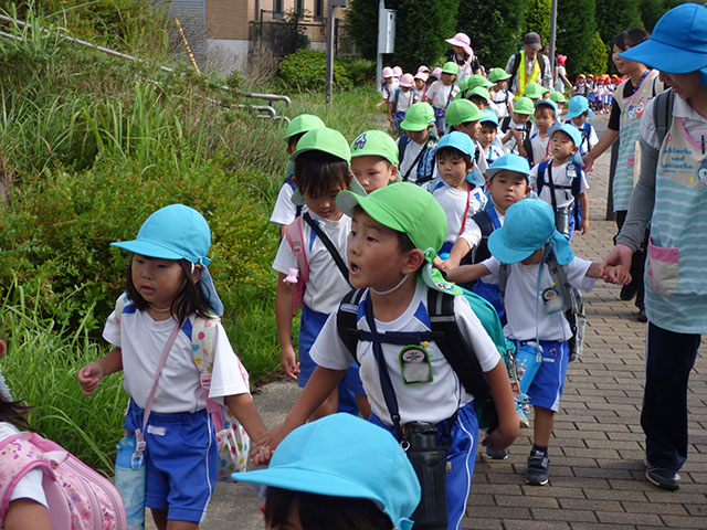 年長組は年少組と手をつなぎ