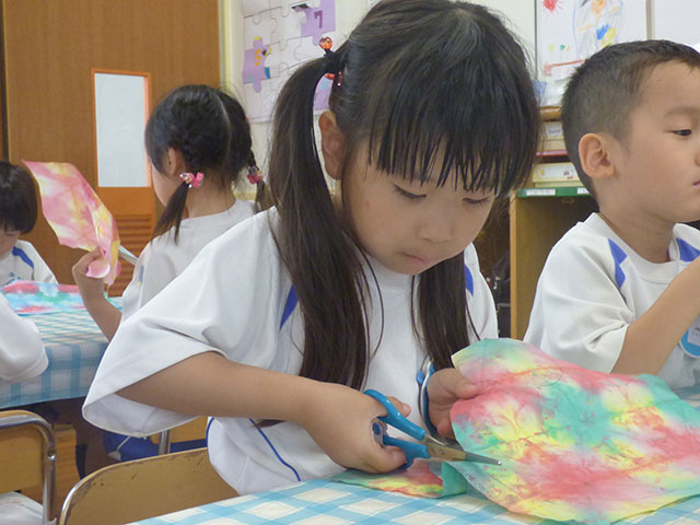 先日作った染め紙をはさみ