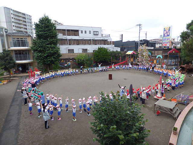 園庭で丸くなり
