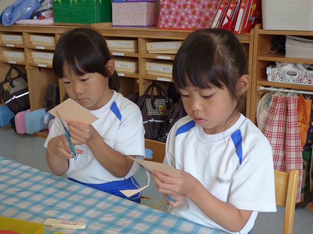 肌色、赤、白の色画用紙をチョキチョキ