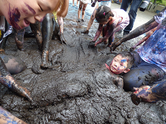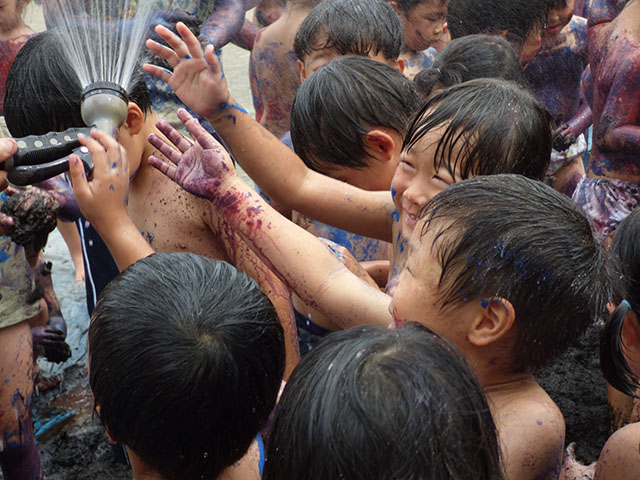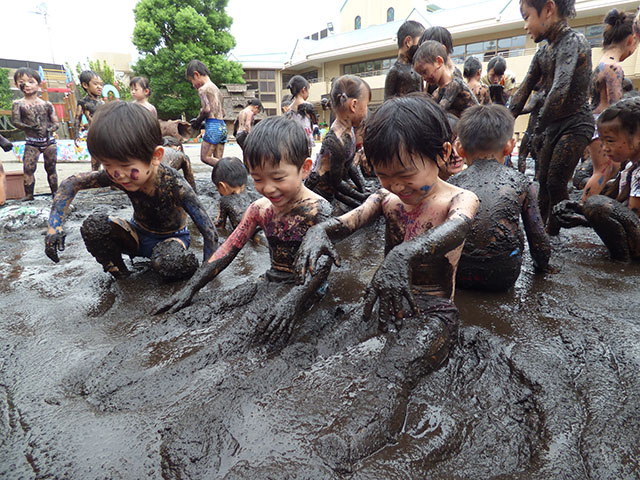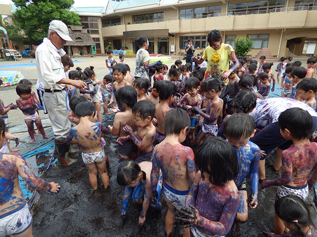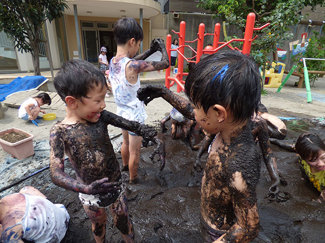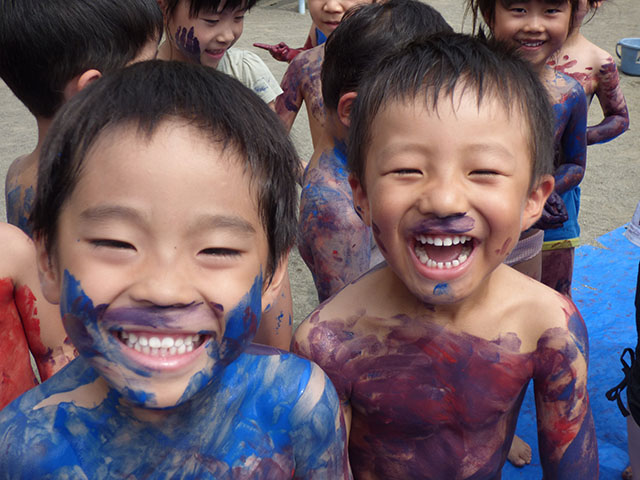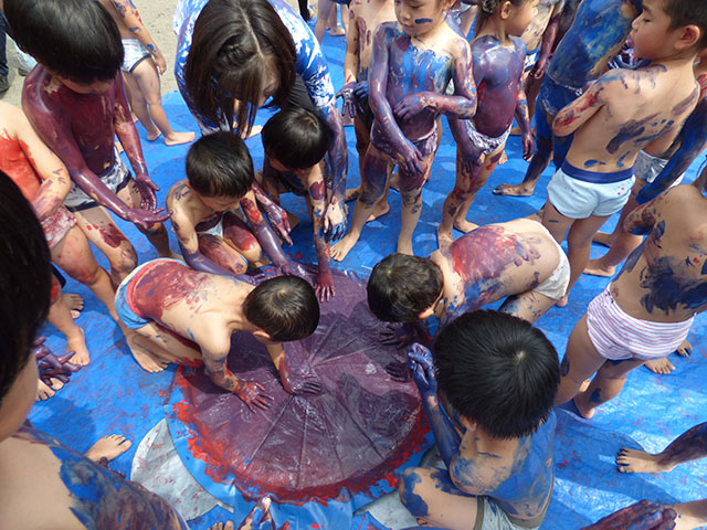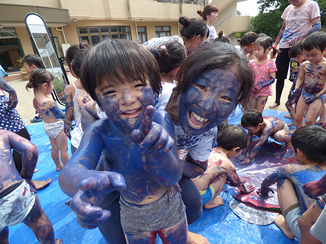 ボディペインティングや泥んこ遊びに、戸惑っていたお友達も、次第にダイナミックに遊び、