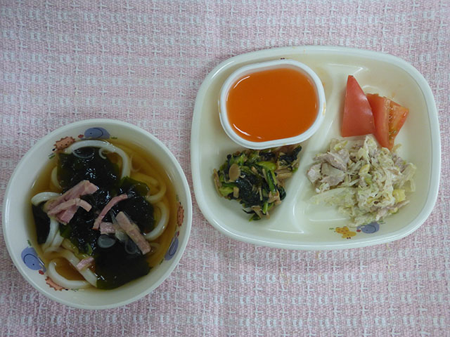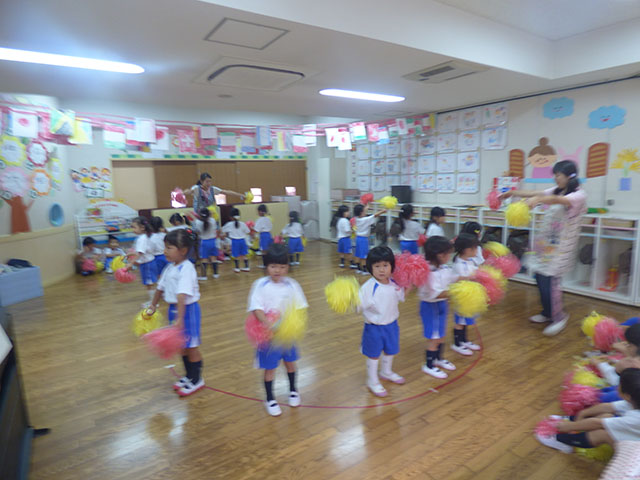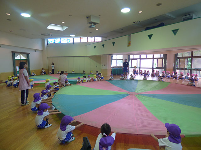 今日も雨になってしまったため、室内での運動会練習や活動を行いました年少組さんはお部屋でお遊戯の練習年中組さんはパラバルーンの練習各技の細かい所を揃えますみんなのタイミングが合うと技がバッチリ決まります年長組さんはダンス教室と書き方教室今日の文字は”ふ”難しい文字でしたが集中して頑張っています大きく立派な字ですね ☆☆今日の給食☆☆・冷やしわかめうどん・冷しゃぶサラダ・トマト・小松菜のなめたけ和え・野菜ジュースゼリー