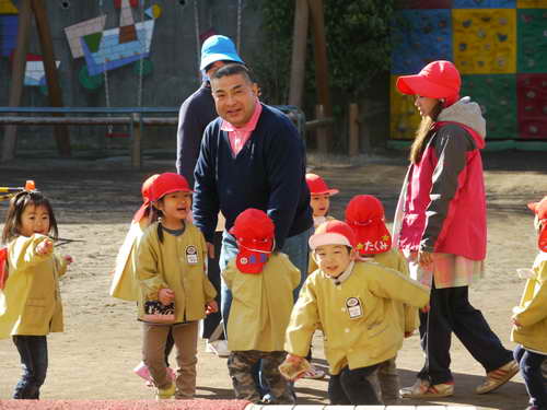 子ども達と一緒にお弁当を食べて下さったあとには園庭でたくさんのこどもたちと一緒に遊んでくださいました!初めてお会いした一琴さんなのにすでに心開く子ども達・・・一琴さんはすごい方です~