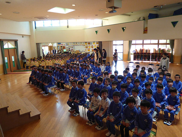 今日は卒園式に向けて、年中少組・年長組の合同練習