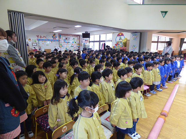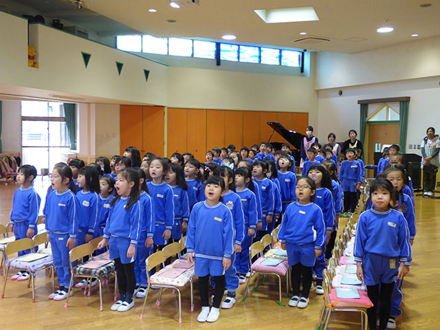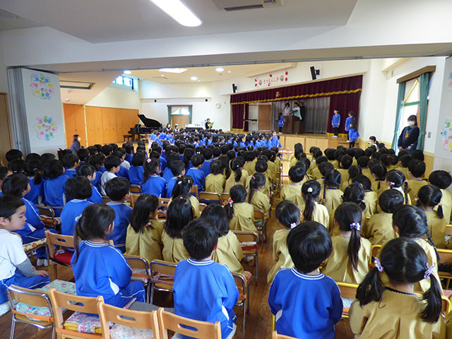 今日の全体練習には、音楽教室の斎藤先生に歌の指導もしていただき、年長組にとっては最後の音楽教室