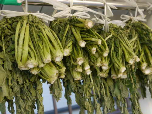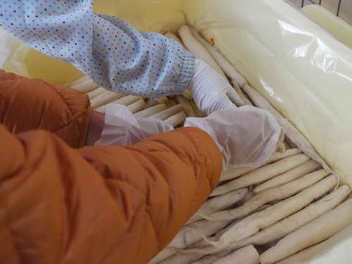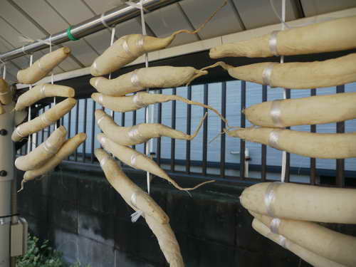 本日、 漬け物樽に白くて細い、ぎゅっと味の詰まっただいこんをならべて