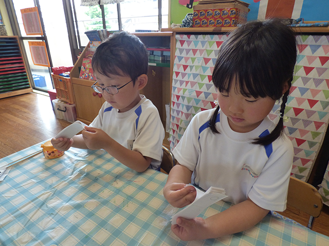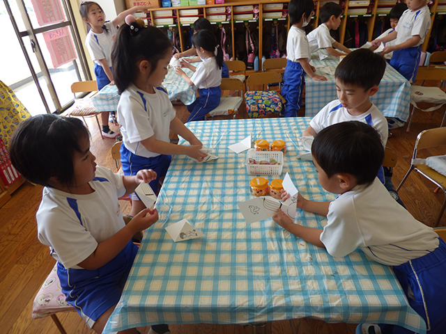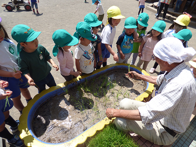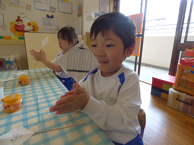 今日は年長組の科学教室を行いました今日は目の錯覚について楽しみました同じ長さの線や同じ色なのに違ってみえたりと不思議がいっぱい次はどんなことがあるのかな~じゃーん完成したのはこれ くるくると回転させると・・・鳥かごの中に鳥が入ってるように見えるね最後にパラパラ漫画を行いました紙の端を素早くめくるとビックリ絵が動いている 嵯峨先生が園庭でお米の赤ちゃんを植えましたみんな興味津々これからの成長が楽しみだね ☆☆今日の給食☆☆・野菜パン・野菜スープ・スパニッシュオムレツ・切り干し大根サラダ・チーズ