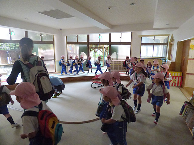 幼稚園の中をぐるぐる歩いて