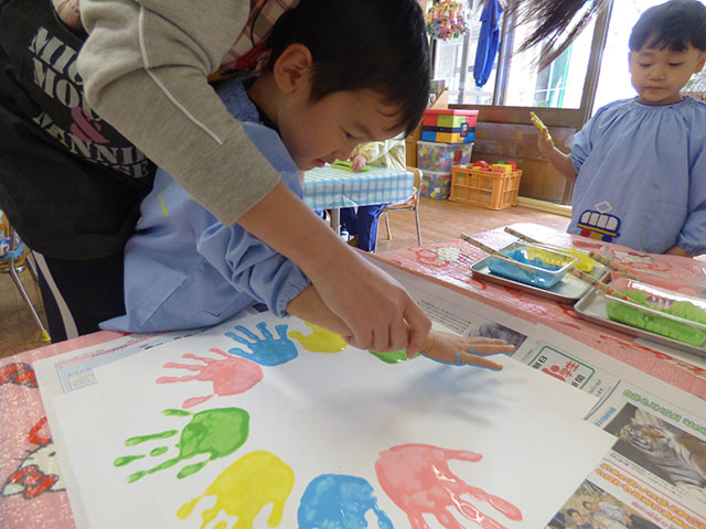 みんなで作る最後の壁面、お友達との