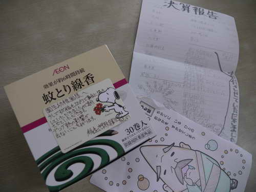 昨日の夜突然、卒園した今高校1年生のやなぎさんが、たけなかくんと一緒に『稲毛中学校卒業生有志』から「デング熱の影響が出ないことを祈ります」とメッセージと塗り絵を添えて蚊とり線香を持って来てくれました。「少しですが稲毛区内で募金に協力していただきましたので寄付させて頂きました。」って・・・正直に立派だと思います。年齢ではなく体の大きさではなく、真剣に周りを考え自らが動き、開拓していける力をもった高校1年生。普通では思いもつかないことをやってくれています。日本の将来を背負っていってくれる大きな希望に思います。他にも20もの施設に足を運び届けてくれています。やなぎさん、たけなかくん、稲毛中学校卒業生有志の方々、そしてご協力下さった多くの方々本当にありがとうございます。今日から大切に使わせていただきました。
