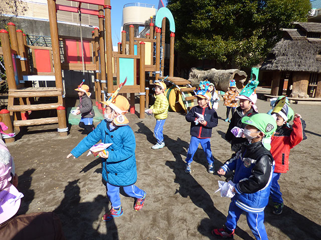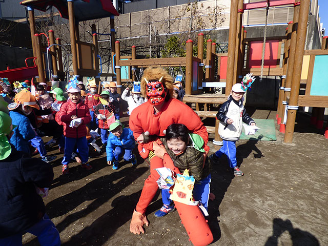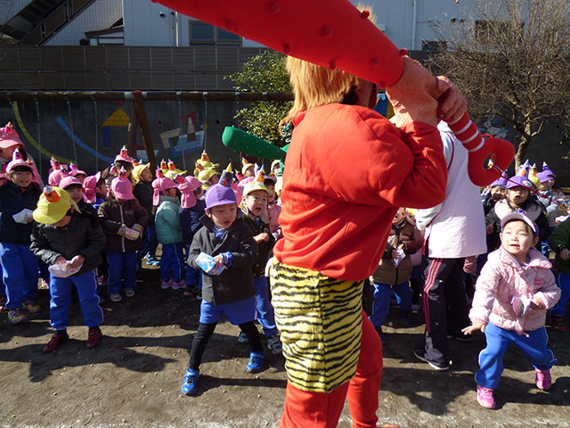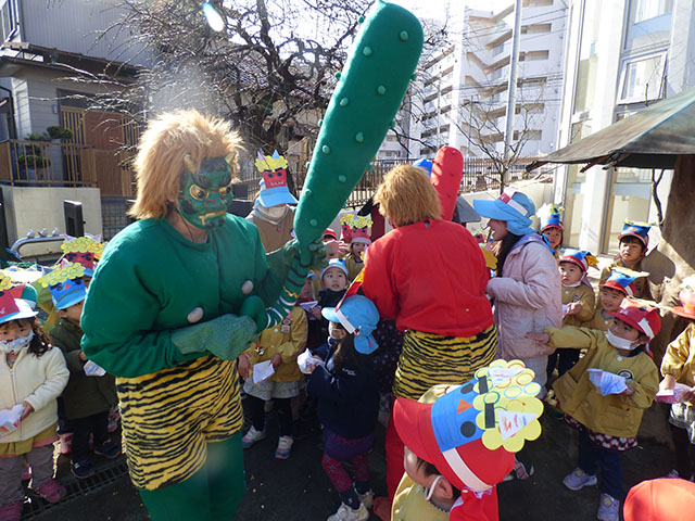 頑張って鬼退治年中組のお友達は、勇気を出して