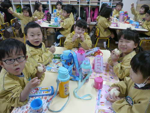 毎月のお誕生会の朝は幼稚園に来ると、甘かったり、香ばしかったりとっても良い匂いがしていますが、今日のおやつが何だかわかったかな?