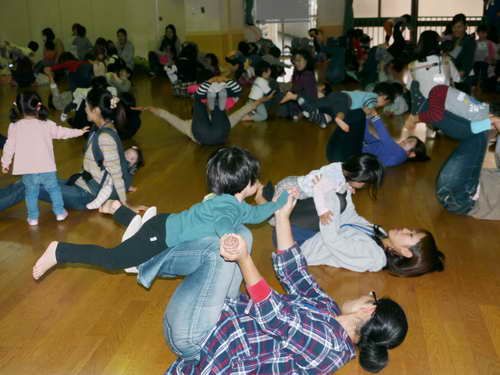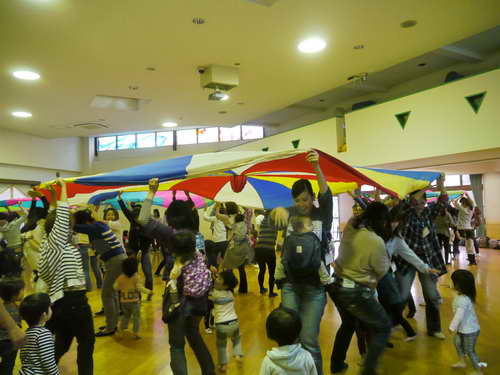 今日はおかあさんたちと一緒にパラバルーンの中に入ってかくれんぼをしたり楽しく遊べましたね