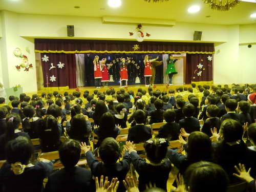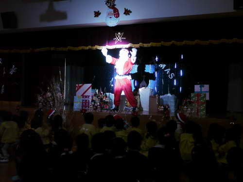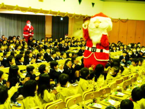 今日は遠い遠~い寒いところから2学期もいっぱいがんばってたみんなにプレゼントを持って会いに来てくれたそうです