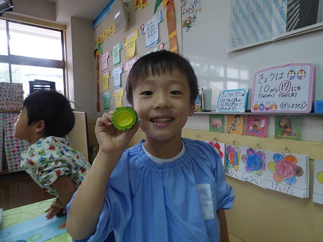 年中組は絵の具の活動を行いました今日は筆は使わずに・・・色々な野菜を使っての野菜スタンプ 野菜の切り方によって出てくる模様が変わって楽しい~ ☆型・〇型・お花模様・・・力加減を気をつけないと壊れてしまう野菜もあるからね素敵なスタンプがいっぱい何の野菜を使ったかわかりますかあててみてね ☆☆今日の給食☆☆・さつま芋ご飯・ぶりの照り焼き・大根きんぴら・ミニトマト・かぶのスープ・グレープフルーツ