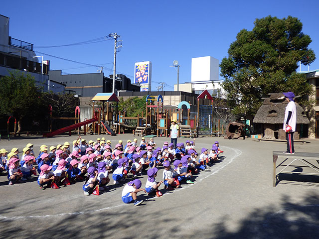 今日は、年中組で学年集合を行い、なわとびに挑戦しました