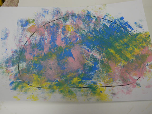 今日は壁面作りで、絵の具遊びをしました