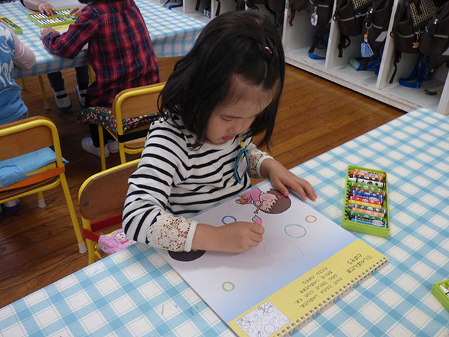 今日はシャボン玉で沢山遊んだ後にクレヨン遊びを行ったので、