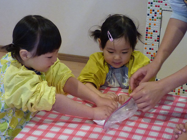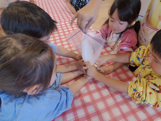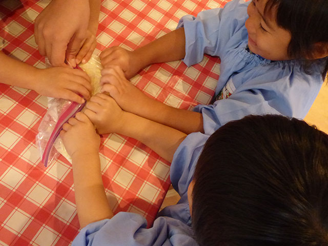 材料を入れた袋をみんなでモミモミ