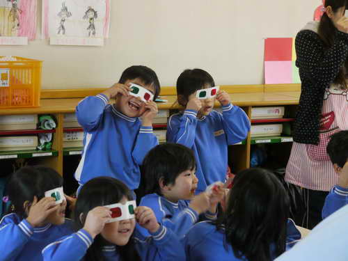 今日の年長さんは科学遊びでめがねを使って不思議を体験しました!