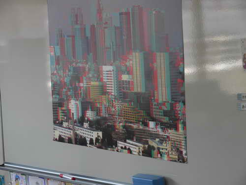 次に、ポスターのビルがいっぱいの写真をじ~っと見つめていたら、どんどんビルが飛び出てきたんです!立体!!