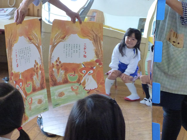 大きな鏡で楽しんだ後は、一人ずつ小さな鏡をもらって楽しみました