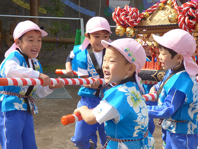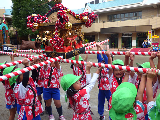 年長組で収穫祭を行いました順番に御神輿を担いで収穫を祝いました年少組・年中組もわっしょい・わっしょいと園庭で応援ですセイヤ・セイヤ セイヤー 元気な掛け声と一緒に御神輿を高く掲げますわっしょい・わっしょい重たいけれど頑張るぞー御神輿を初めて間近で見たお友達や、初めて担いだお友達も多く、大盛り上がり良い経験になりましたね