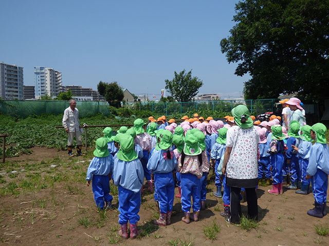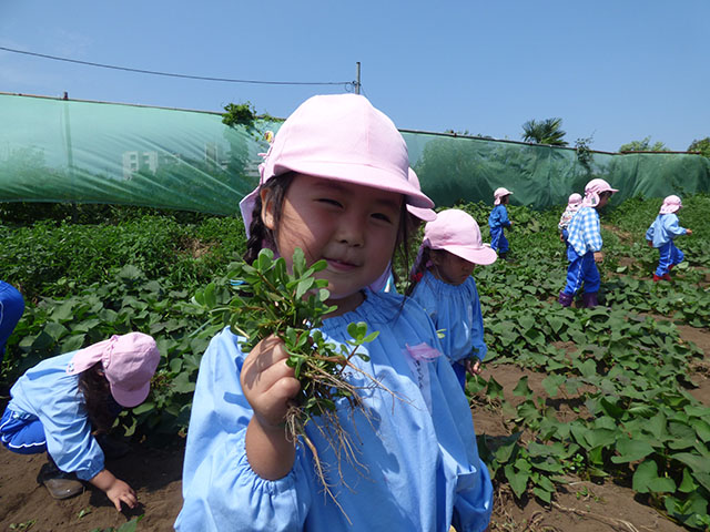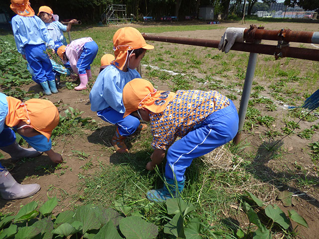 今日は、年長組さんがグランドへお芋の草取りに行きました