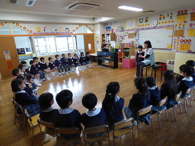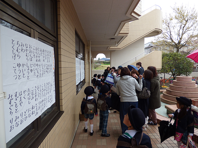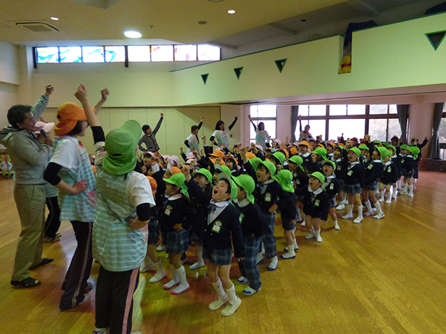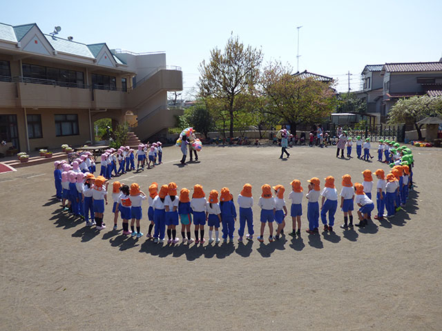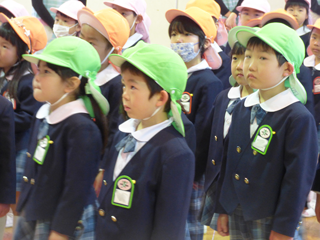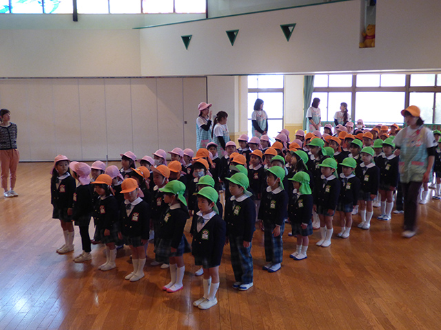 今日は、待ちに待った始業式いよいよ平成29年度がスタートしましたわくわくドキドキのクラス発表玄関で担任の先生に名札をつけて貰います嬉しさ緊張照れくささ色々な気持ちがいっぱいですね いよいよ始業式新しいクラスで初めての整列ピカピカの帽子の姿が眩しいですね年長組になった期待がいっぱいで格好良い顔つきでした 年長組頑張るぞ・オーで一年のスタートです思いっきり楽しもうクラスに戻ってからは自己紹介名前や好きな物を発表しました ドキドキしながらも頑張って発表できました 今日は笑顔の中にも、緊張がいっぱいで、頑張っている姿も沢山見られましたこれからいっぱいお友達と関わって楽しい一年にしましょうね