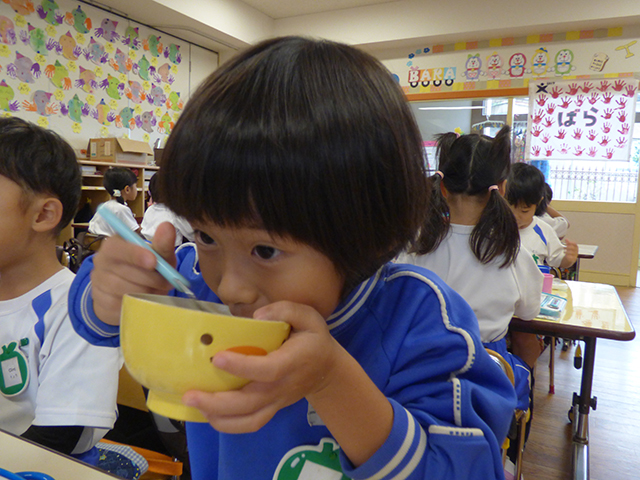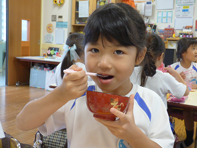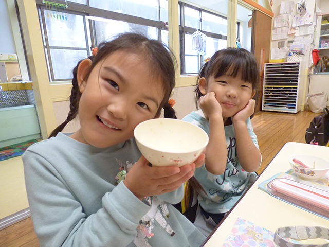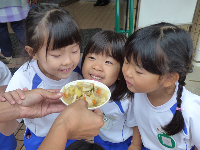みんなが切ったお芋や野菜やこんにゃくたっぷりのお味噌汁を